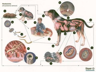 Roundworms have complex life cycles involving eggs passed in feces that develop into infective larvae. Puppies, kittens, and young animals are most commonly infected through prenatal, nursing, or environmental exposure. Roundworm larvae migrate through tissues before maturing and reproducing in the intestines, completing their life cycles. Regular deworming is especially important for hunting or outdoor animals to prevent roundworm infection and spread.