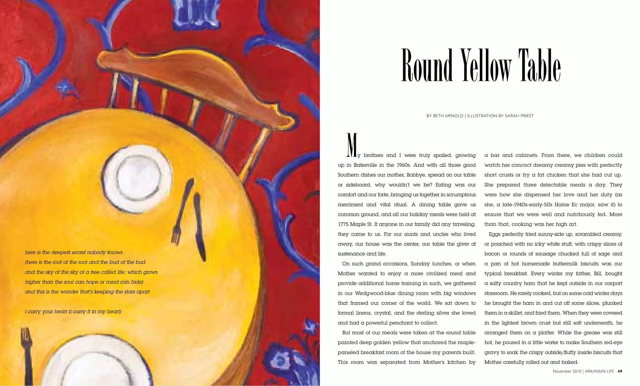 The document reflects on the author's nostalgic memories of family meals centered around a round yellow table in Batesville, Arkansas during the 1960s. It highlights the strong connections forged through shared meals and the love expressed through cooking, particularly by the author's mother. The narrative intertwines personal anecdotes with culinary traditions and the family's Southern heritage, emphasizing the importance of food in their lives and relationships.