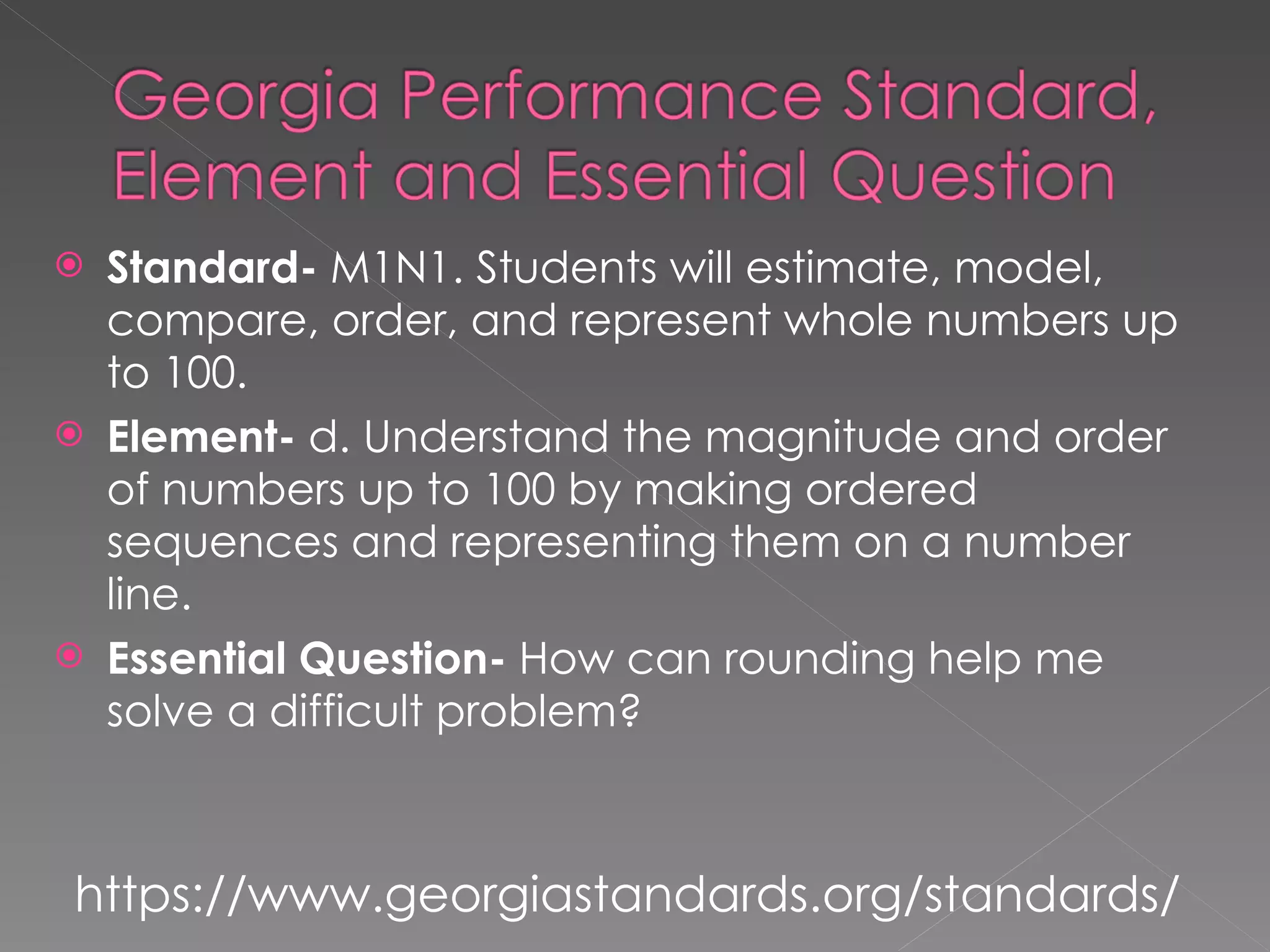 The document provides information about rounding numbers up to 100 to the nearest ten. It gives the rule for rounding which is to round down if the number is 4 or less, and round up if it is 5 or more. An example poem is also given to help remember the rounding rule. Several examples are worked out showing how to round numbers like 36, 74, 73, and 77 to the nearest ten. Students are then asked to round 5 numbers like 19, 73, and 92 to practice the skill.