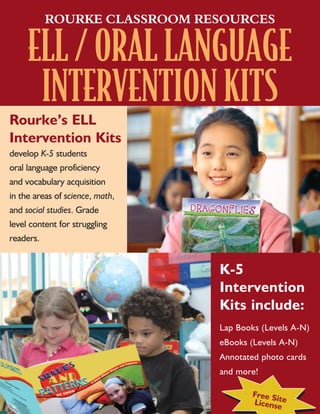 Rourke's classroom resources offer oral language intervention kits designed to support K-5 students' sight and sound proficiency, particularly for struggling readers in subjects like science, math, and social studies. Each kit includes multiple formats of grade-appropriate titles, lap books, and educational materials that facilitate differentiated instruction and engage learners. The resources are available in both e-format and companion print versions, and utilize technology to enhance learning experiences.