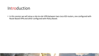 This document provides a guide for setting up a site-to-site VPN between two Cisco IOS routers, one using route-based VPN and the other using policy-based VPN. It includes pre-configured router settings, detailed configuration steps for both routers (R1 and R2), and verification references for successful implementation. The process focuses on crypto policies and IP address assignments to establish secure connections.
