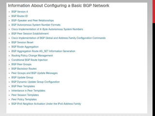The document outlines the functions, types, and internal components of routers, emphasizing their role in forwarding data packets between networks. It categorizes routers into hardware and software types, as well as specific types like core, edge, and wireless routers, detailing their respective functions and purposes. Additionally, the document touches on Border Gateway Protocol (BGP) and mentions notable manufacturers such as Cisco and TP-Link.
