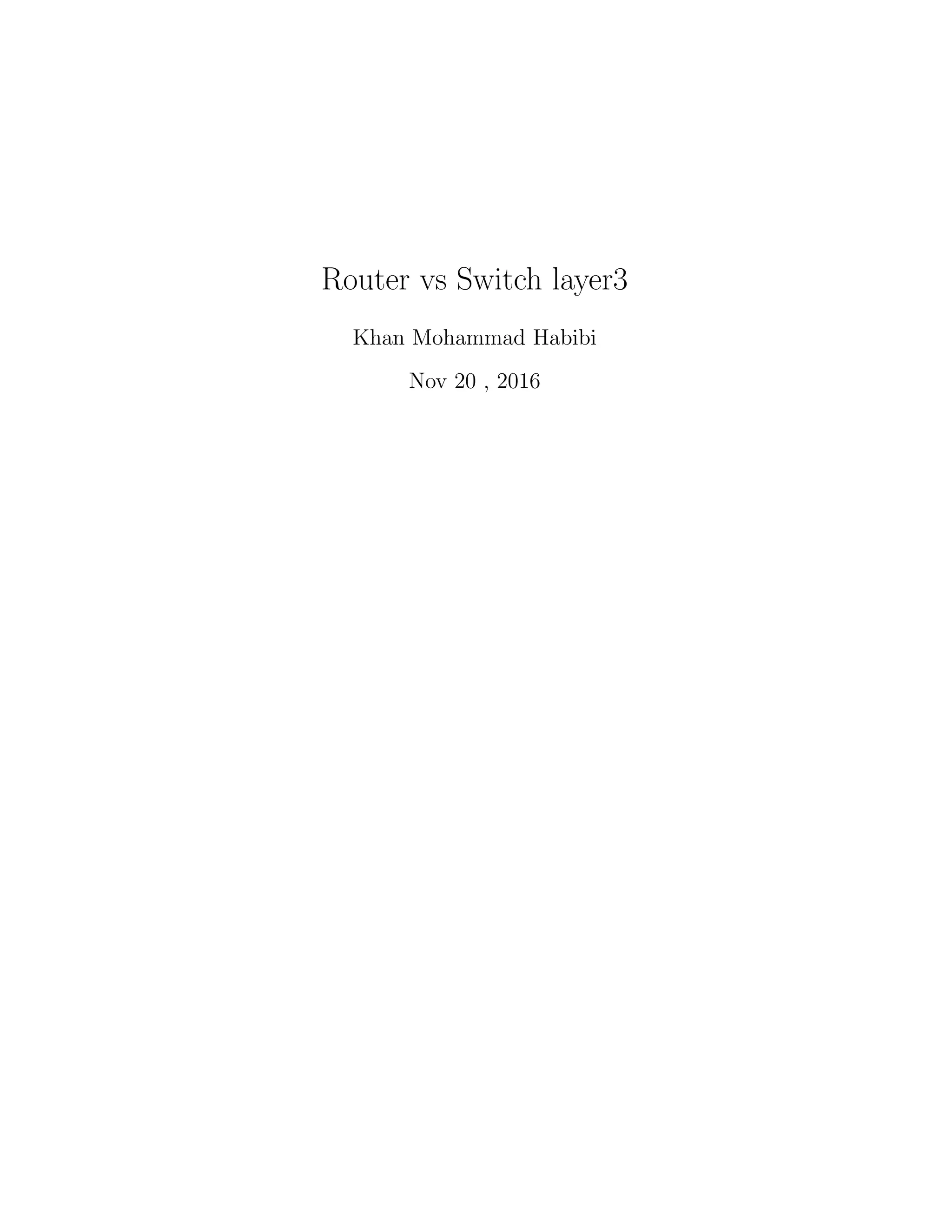 The document compares layer 3 switches and routers. It discusses their differences in performance, cost, port density, flexibility and supported protocols. Layer 3 switches are faster than routers for routing within a LAN but routers can connect LANs, MANs and WANs. They both support static and dynamic routing protocols, though layer 3 switches have limitations. While routers have more capabilities, layer 3 switches are more cost effective for high-speed inter-VLAN routing within a LAN. Both devices are needed to build a fully functional network.