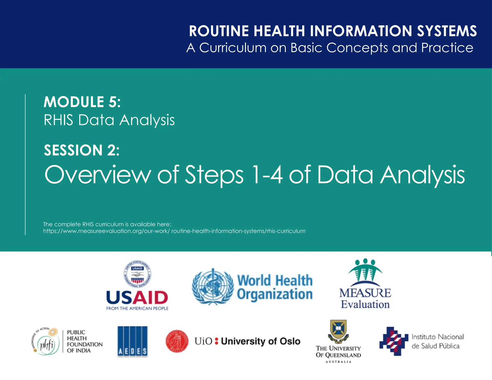 This document provides an overview of steps 1-4 for data analysis routines in health information systems, focusing on selecting indicators, reviewing data quality, selecting denominators, and reconciling findings with other data sources. Participants will learn to identify appropriate indicators, assess data completeness, and analyze data to produce informative outputs. The curriculum aims to enhance understanding and practices related to routine health information systems.