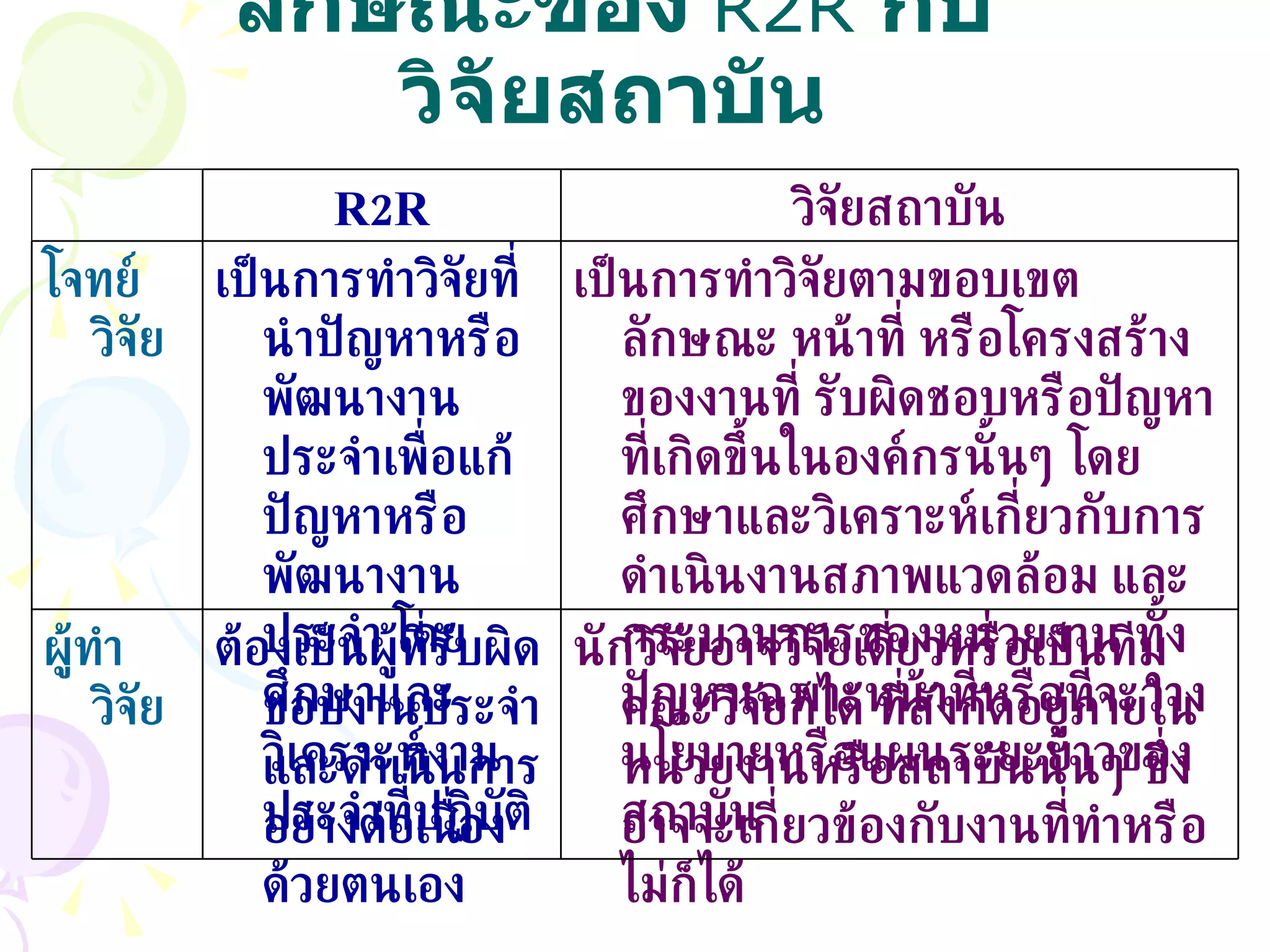 ลักษณะของ R2R กับวิจัยสถาบัน เป็นการวิจัยเชิงปฏิบัติการ ( Action Research) เป็นการวิจัยเชิงประยุกต์ (Applied Research) ประเภทงานวิจัย เพื่อให้ผู้บริหารจะต้องนำข้อค้นพบจากการวิจัยมาประกอบในการแก้ปัญหาหรือกำหนดนโยบายพัฒนาองค์กรหรือตัดสินใจในภาวการณ์ที่คับขัน เป็นต้น ต้องวนกลับไปมีผลเปลี่ยนแปลงการทำงานโดยตรงหรือต่อการบริการโดยตรง เป็นความสำเร็จระดับผลลัพธ์ ( outcome) การนำไปใช้ประโยชน์ ผลวิจัยนำมาแก้ปัญหาหรือกำหนดนโยบายหรือพัฒนาองค์กรเท่านั้น แต่อาจเป็นแนวทางในการวิจัยสถาบันอื่นได้ ต้องวัดที่ผลผลิต ( output) เกิดกับตัวผู้ปฏิบัติและงานที่ทำ ผลลัพธ์ของการวิจัย วิจัยสถาบัน R2R - 4.