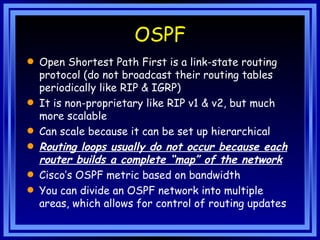 - OSPF is a link-state routing protocol that is more scalable than RIP. It builds a complete "map" of the network to avoid routing loops.