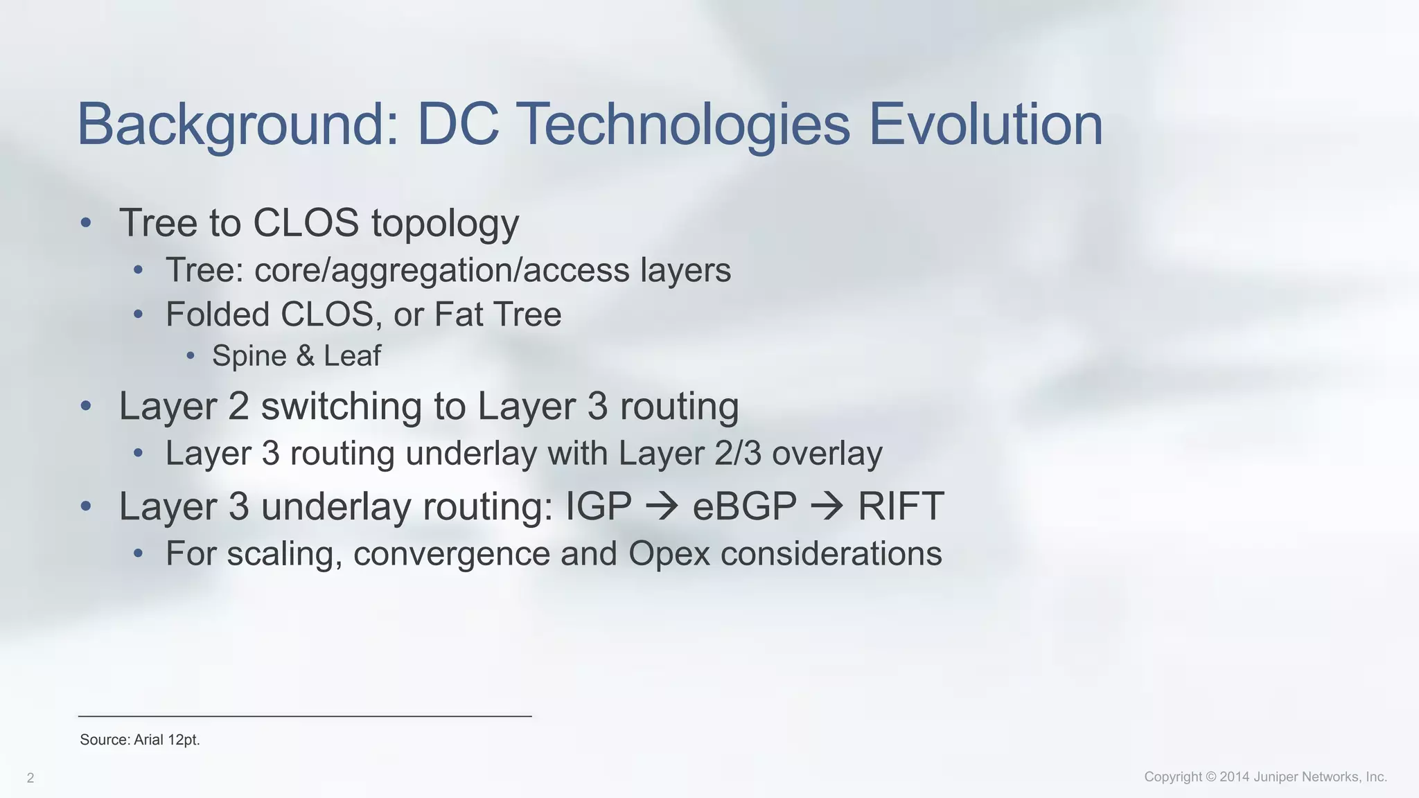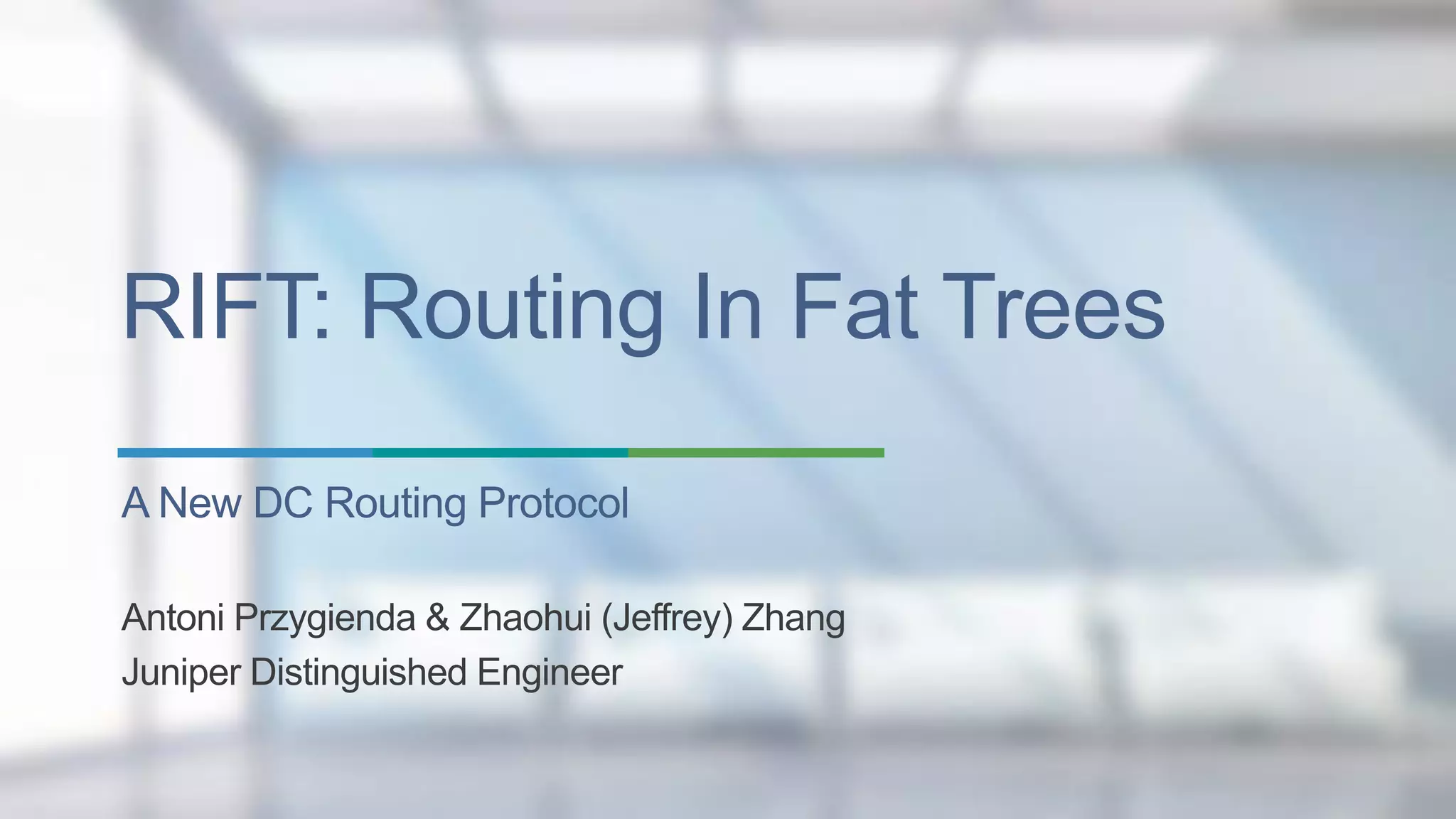 RIFT is a new data center routing protocol that addresses issues with using link-state IGP protocols and eBGP as underlay routing protocols in large-scale data centers. It uses link-state routing northbound for fast convergence while using distance-vector routing southbound to minimize the amount of routing information stored and advertised on top-of-rack switches. RIFT also supports features like automatic route disaggregation to prevent blackholes, fast decommissioning of nodes, and zero-touch provisioning. It has been standardized through the IETF and implemented in Juniper and open source software.