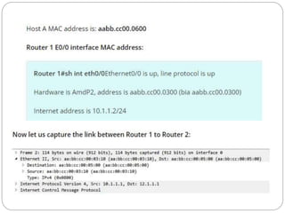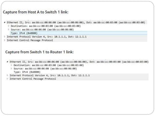 Packet flow and processing involves knowing the source and destination IP addresses, source and destination MAC addresses. If the destination host is in the same network, the packet is delivered directly, otherwise it goes to the default gateway first. ARP is used to resolve IP to MAC addresses. When pinging from Host A to Host B, the packet first goes from Host A to the default gateway, then the gateway sends it to the second gateway, which sends it to Host B, with only the MAC addresses changing at each hop while the IP addresses remain the same.