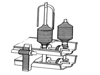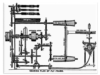 The document discusses the roving frame machine, which comes after the draw frame in the spinning process. The roving frame drafts sliver from draw frame cans into a thin roving strand and applies a light twist. It operates by drafting the sliver, guiding it through the flyer to apply twist, and winding the roved strand onto bobbins. While complicated, the roving frame produces packages of roving suitable for input to the ring frame. Efforts to eliminate this step have not succeeded due to the high drafts required in ring frames.