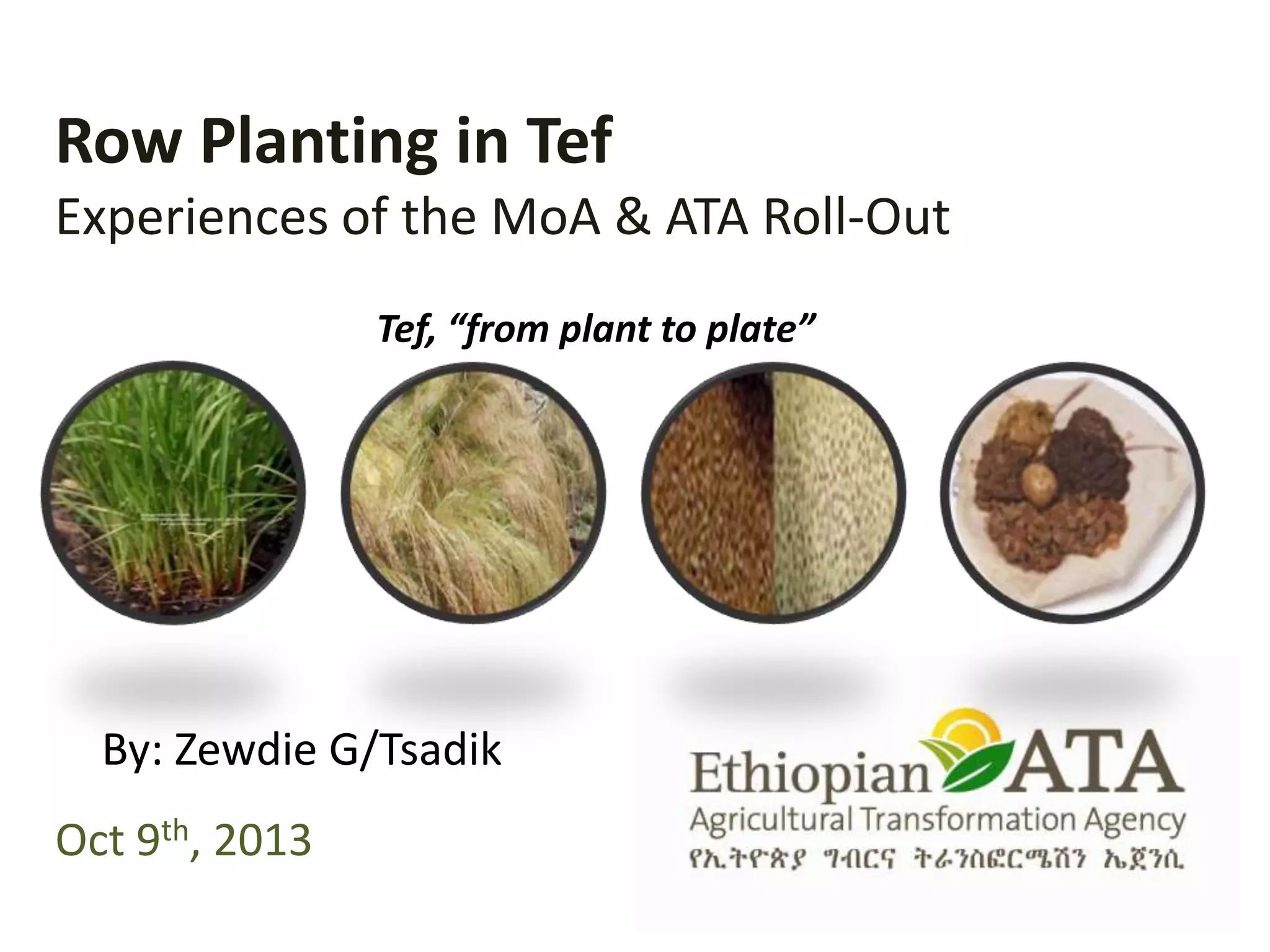 The document discusses the rollout of tef (Eragrostis tef) technology packages in Ethiopia, highlighting its significance as the most important crop and its benefits such as high nutritional value and drought resistance. Key developments include methods to increase yields through row planting, reduced seed rates, and proper fertilizer application, leading to significant yield increases for participating farmers. Ongoing efforts aim to refine these technologies, encouraging more farmers to adopt practices that have shown potential for high productivity gains.