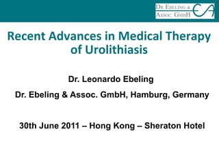 Dr. Leonardo Ebeling presented on recent advances in medical therapy for urolithiasis. He discussed treatment options including watchful waiting, pain control, and invasive or noninvasive surgery. Noninvasive options include extracorporeal shock wave lithotripsy (ESWL) and medical expulsive therapy (MET). MET uses pharmaceuticals to help pass stones naturally. Potential drug targets discussed included calcium channels, alpha1-adrenergic receptors, anti-inflammatories, phosphodiesterases, and muscarinic receptors. Rowatinex, a traditional herbal medicine containing purified terpenes, was highlighted as a multi-target MET option that may help reduce stone formation and passage through various