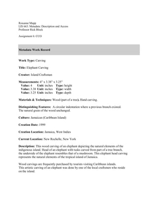 This document summarizes metadata about a carved wooden elephant from Jamaica. It describes the item as a 4" tall wood carving of an elephant head created circa 1999 by an unknown Jamaican craftsman. Key details provided include the materials, techniques, measurements, creation location, current location, and a description noting the carving depicts natural elements of Jamaica and was likely made for tourists.