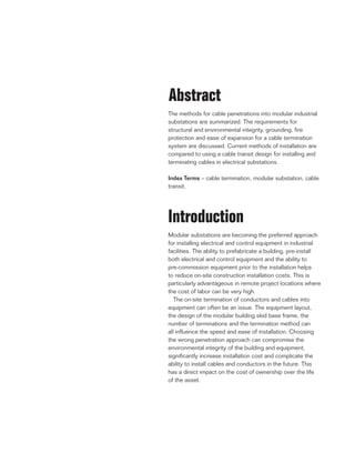 The document summarizes methods for cable penetrations into modular substations. It discusses using a cable transit system as an improved option over traditional methods, as it provides structural integrity, environmental sealing, ease of installation and expansion capacity. The cable transit system allows multiple cables to be pulled through at once and sealed using transit blocks, maintaining the enclosure seal while providing additional working space below equipment. Engineering, fabrication and installation processes are outlined.