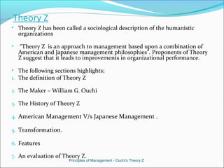William Ouchi proposed Theory Z, which combines American and Japanese management styles. Theory Z emphasizes long-term employment, consensual decision-making, individual responsibility balanced with group responsibility, and holistic concern for employees. It aims to improve employee satisfaction, commitment and company performance by incorporating aspects of Japanese-style management while retaining American individualism. Theory Z has seen mixed results in implementation and has received some criticism.