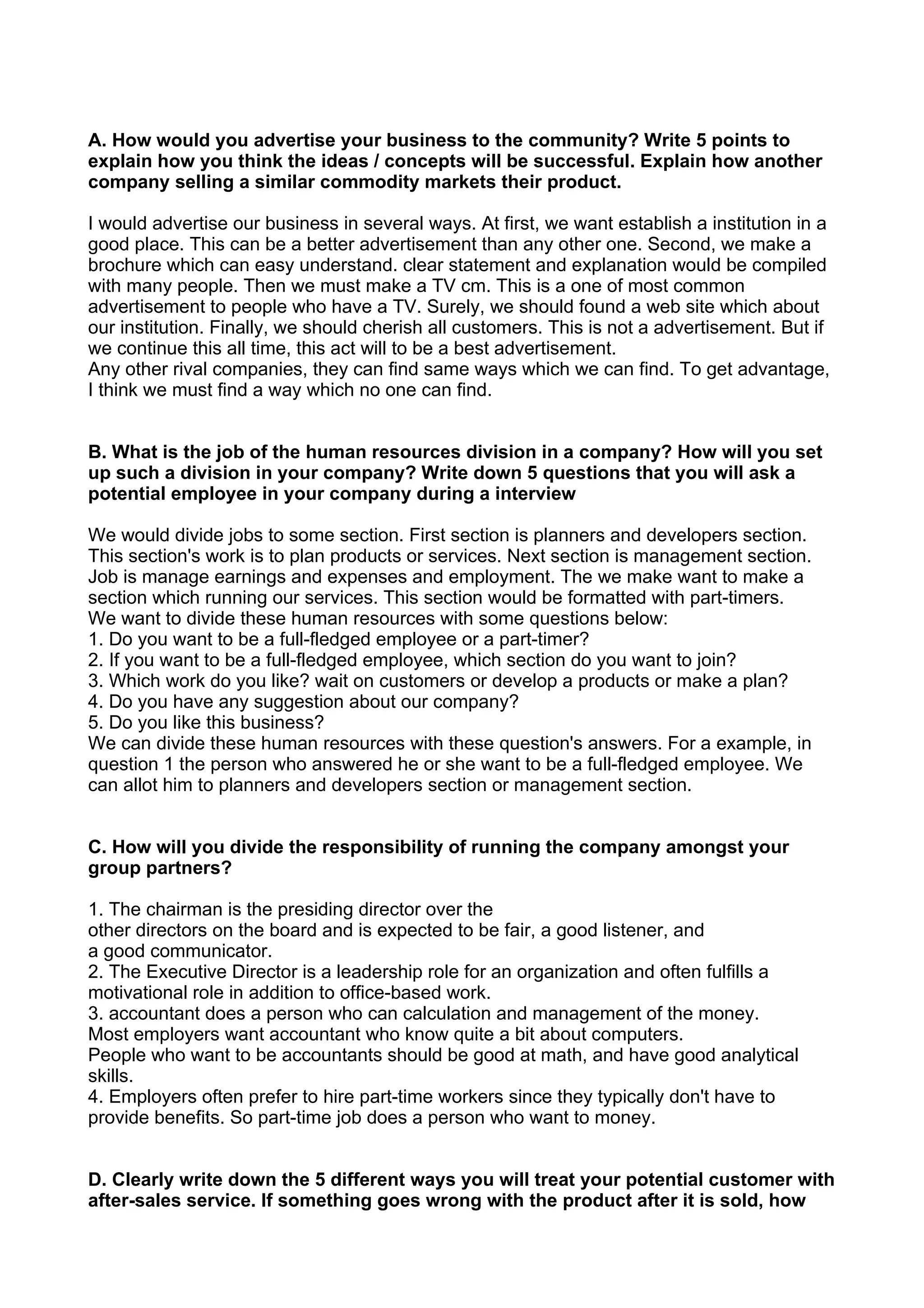 This document contains responses to 5 prompts about starting and running a business. For prompt A, the response discusses advertising the business by establishing a good location, making brochures, TV commercials, a website, and good customer service. For prompt B, the response discusses dividing the human resources department into planning, management, and service sections, and lists 5 interview questions. For prompt C, the response discusses dividing responsibilities amongst partners by designating one as chairman, one as executive director, one as accountant, and hiring part-time workers. For prompt D, the response lists 5 ways of providing after-sales customer service and gives an example of a product issue. For prompt E, the response discusses studying local competitors' locations,