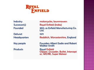 Royal Enfield was founded in 1893 in Redditch, Worcestershire, England. During World War I and World War II, Royal Enfield supplied large numbers of motorcycles to the British and Russian militaries, including models fitted with machine guns. In 1971, Royal Enfield went defunct but continues to operate today based in India, where it has focused on producing the popular Bullet motorcycle model since 1949.