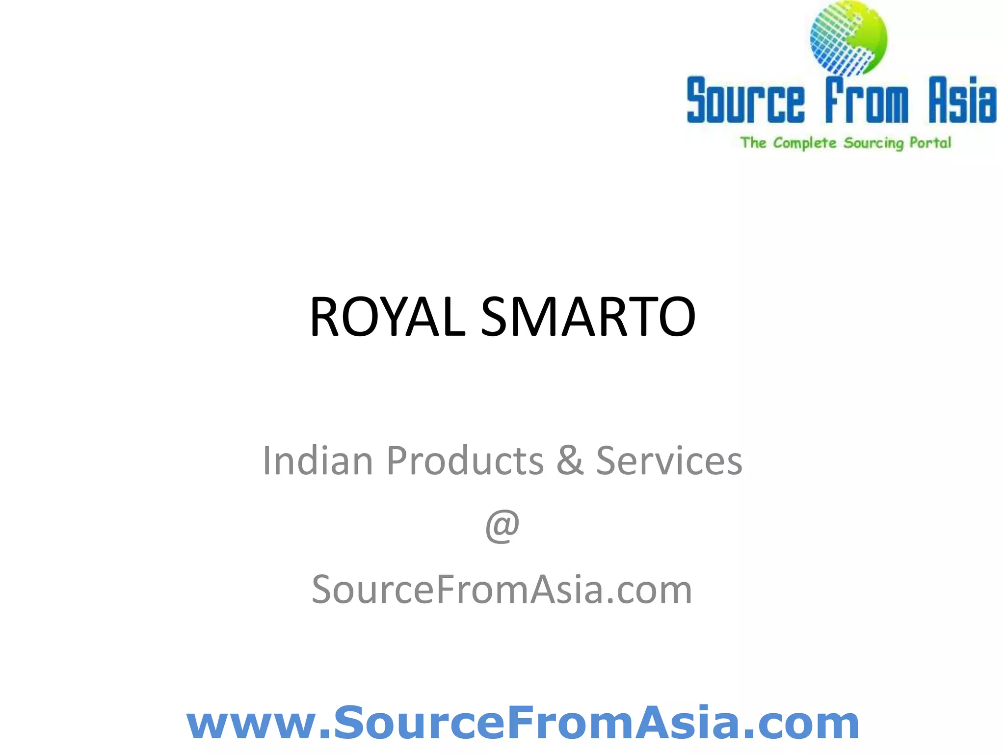 Royal Smarto offers a variety of Indian products and services through the sourcing portal SourceFromAsia. The site provides free sourcing and buying advisory for buyers interested in Indian offerings. For inquiries, buyers can contact via email or Skype listed on the website.