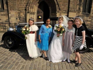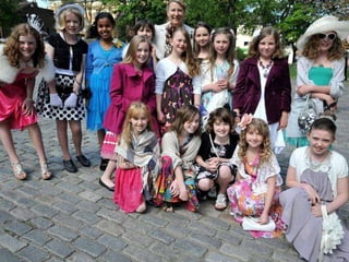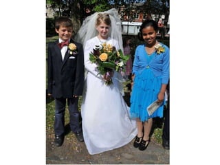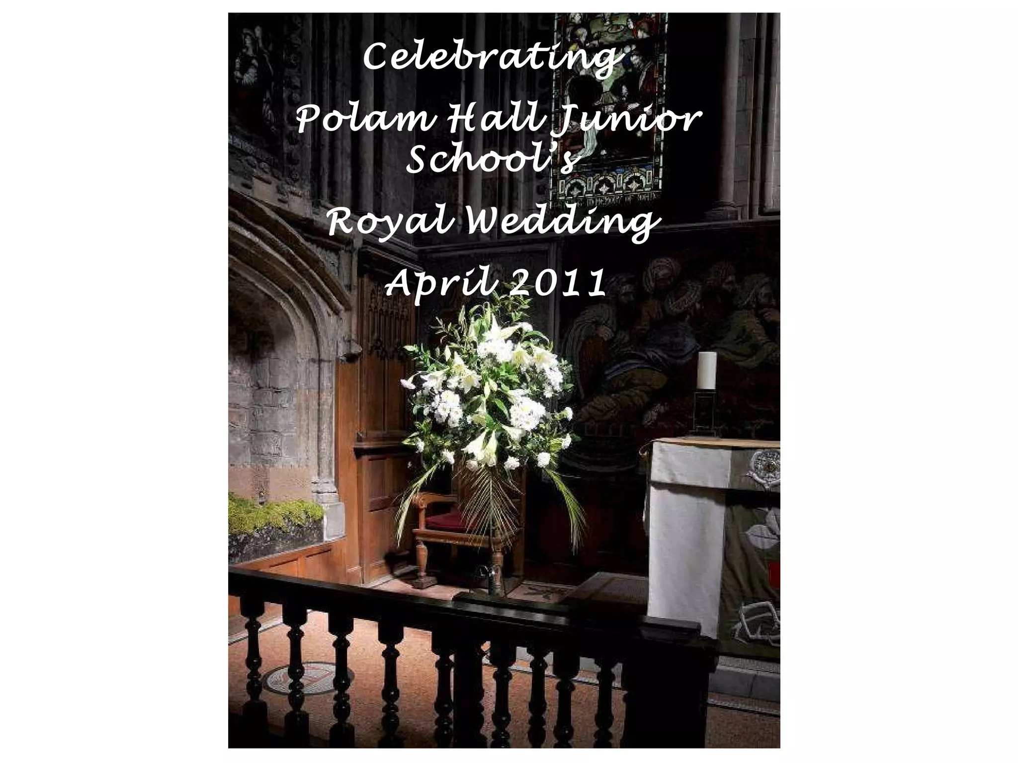 Polam Hall Junior School celebrated the royal wedding of Prince William and Catherine Middleton in April 2011 by dressing up in wedding attire and reenacting scenes from the wedding. Students and teachers tried on fancy hats, created wedding bouquets, and pretended to get married in the school marquee or church. They imitated moments like the bride's arrival by vintage car and the newlyweds' first kiss. The mock wedding celebration allowed the school to share in the excitement of the royal nuptials.