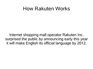 Rakuten announced in early 2012 that it will make English its official language company-wide by 2012. All internal meetings will be conducted in English, even if no foreigners are present. Board meetings have been in English since March 2012, and the president has said that board members who cannot speak English within two years will be fired. Employees are under pressure to learn English, with 200 out of 3,000 headquarters employees taking lessons. Achieving certain scores on the TOEIC English test will be required for promotion, with scores ranging from 600 to 750 depending on job title. The company aims to expand overseas, so setting English as the official language will help it conduct business globally.