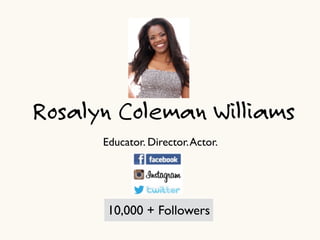 Rosalyn Coleman Williams is an accomplished actor, director, and educator. She has over 30 years of experience in theater, film, and television. She is highly sought after as an acting coach and has taught at numerous prestigious institutions. Williams has had leading roles in films and Broadway productions. She runs her own production company and is the recipient of several awards for her work as both an actor and director.