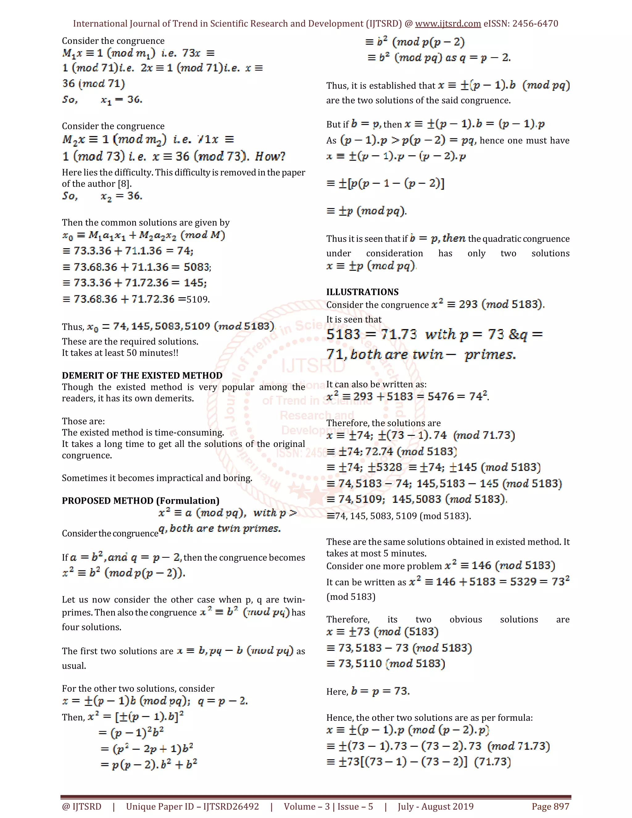 This document presents a new formulation for solving standard quadratic congruences when the modulus is a product of twin primes. The existing method of using the Chinese Remainder Theorem is time-consuming. The proposed formulation provides a simple formula to find all four solutions in such cases in only 5 minutes, compared to 50 minutes for the existing method. The formulation is proved through examples. If the congruence has only two solutions, a separate formula is given. This formulation reduces the time needed to solve this type of problem compared to existing methods.