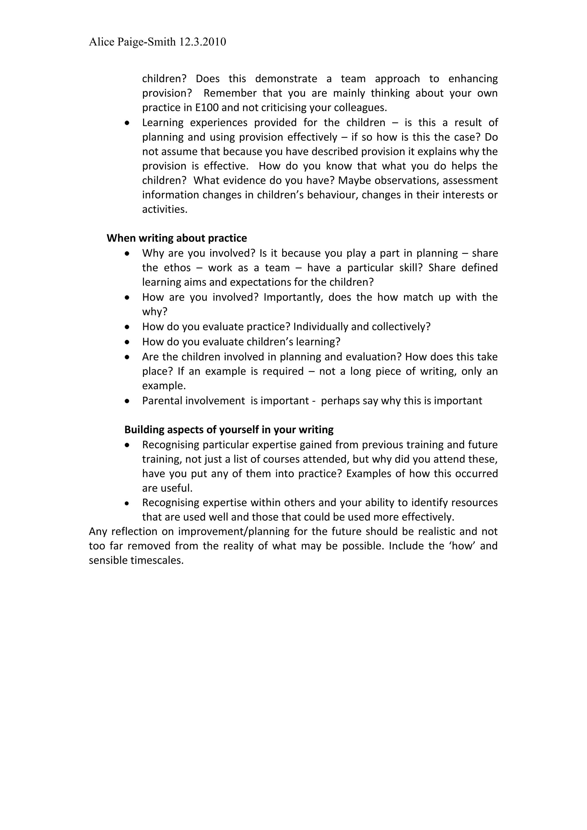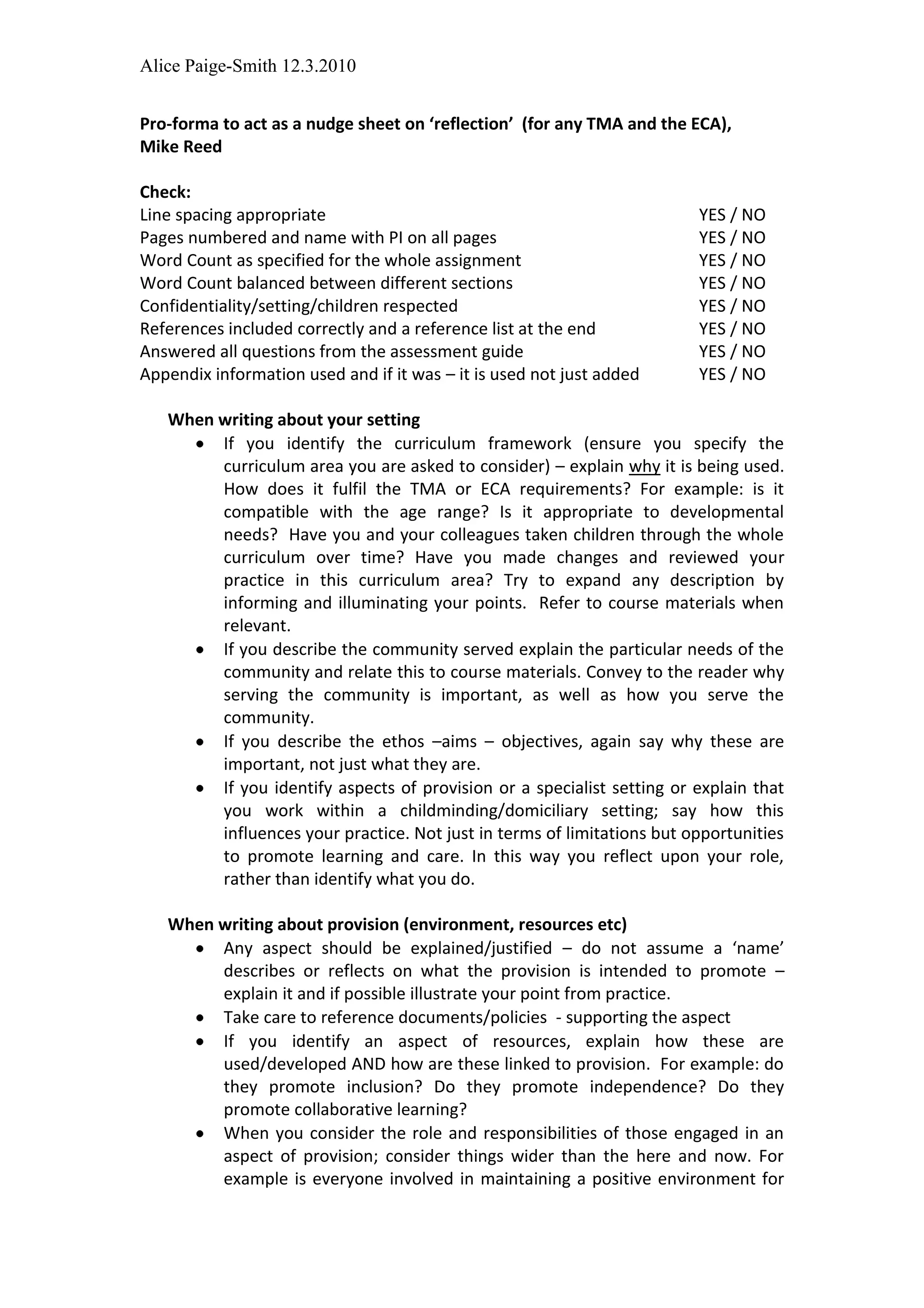 This document provides a checklist and guidance for students to structure reflections in assignments. It suggests including checks that formatting requirements are met, word counts are accurate, confidentiality is maintained, and questions are answered. When writing about settings, curriculum, community needs, ethos and roles, the document advises explaining their importance and influence on practice. When describing provision, resources, learning experiences and practice, justification and evidence of effectiveness should be provided. Reflections should discuss the student's involvement, evaluation approaches, and plans for realistic improvements.