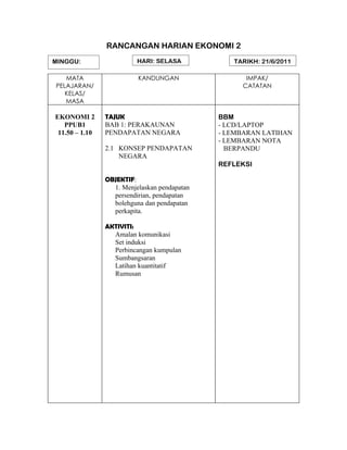 Rangkuman dokumen ini memberikan ringkasan aktiviti pelajaran ekonomi selama seminggu. Aktiviti tersebut meliputi latihan soalan ujian, perbincangan konsep ekonomi seperti pendapatan negara dan pertumbuhan ekonomi, serta latihan menjawab soalan ujian. Aktiviti-aktiviti ini bertujuan untuk memperkukuh pengetahuan pelajar dalam bidang ekonomi.