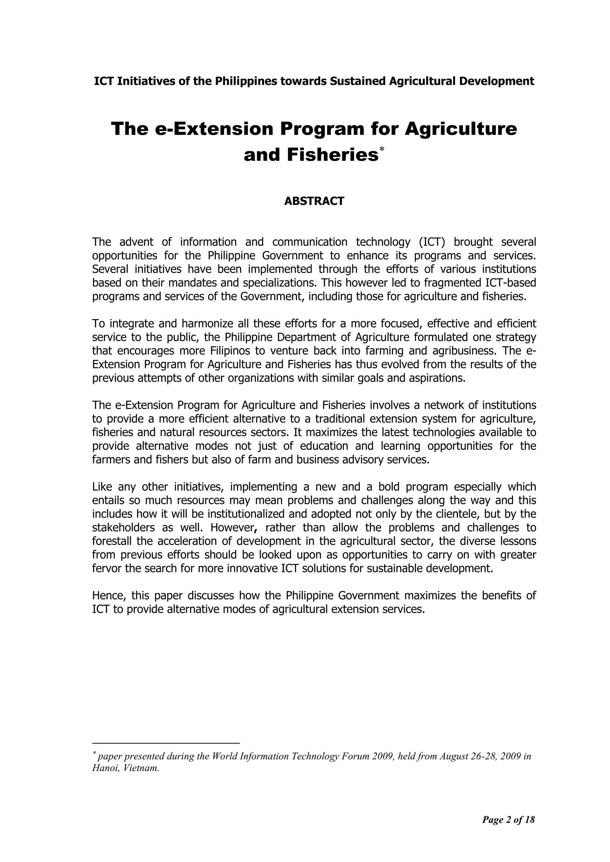 The document discusses the e-extension program for agriculture and fisheries in the Philippines, which aims to modernize and harmonize ICT-based services for improved agricultural extension. It emphasizes the collaboration of various institutions to create an efficient system offering education and advisory services to stakeholders, primarily farmers and fishers. Key components include e-learning, e-farming, and a text support center to facilitate information exchange and enhance productivity in agriculture and fisheries.