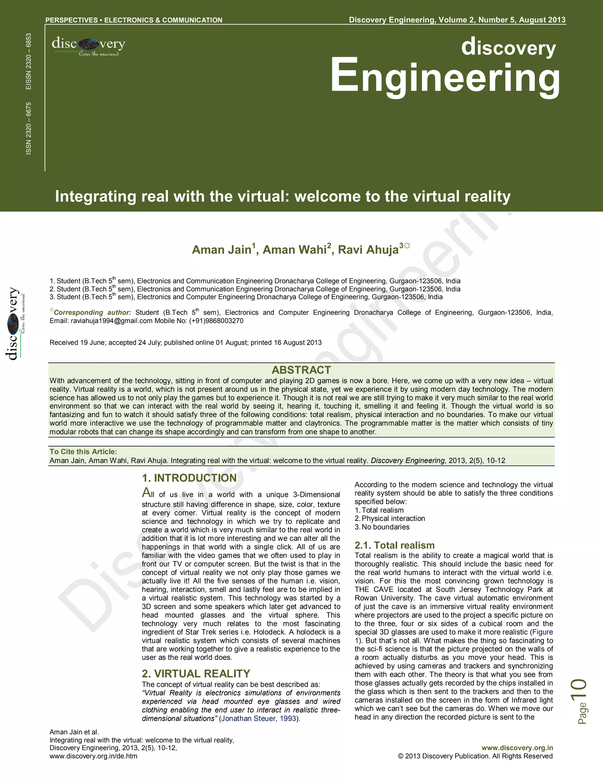 This document summarizes an article on virtual reality technology. It discusses three key aspects of virtual reality that make it similar to the real world: total realism, physical interaction, and no boundaries. Total realism is achieved through technologies like CAVE that use projectors and tracking to create 3D immersive environments. Physical interaction is enabled by programmable matter technologies like catoms, which are tiny modular robots that can change shape and properties. Having no boundaries is achieved through virtual spheres and omni-directional treadmills that allow infinite virtual worlds without physical constraints. The document outlines the technologies and research that are integrating the real world with virtual worlds.
