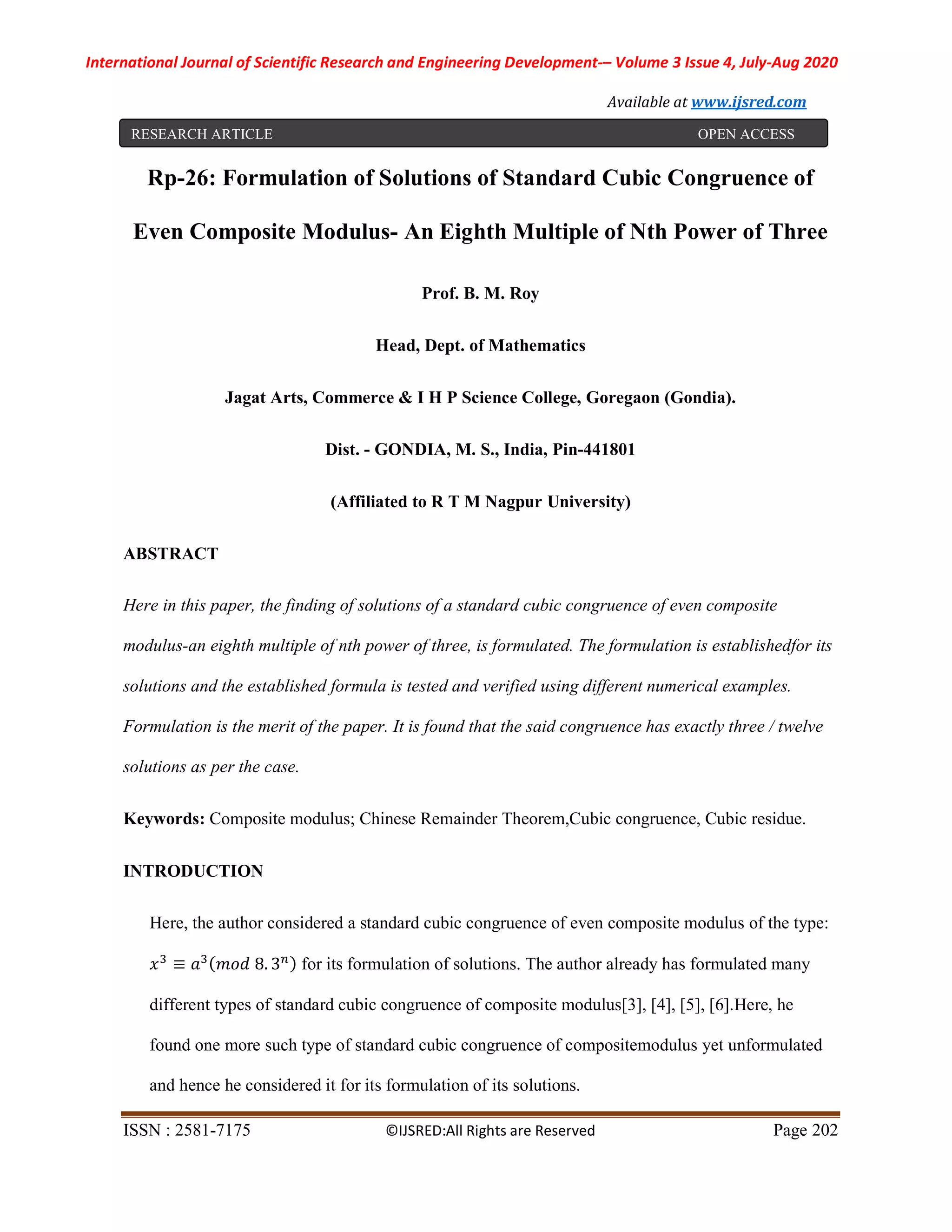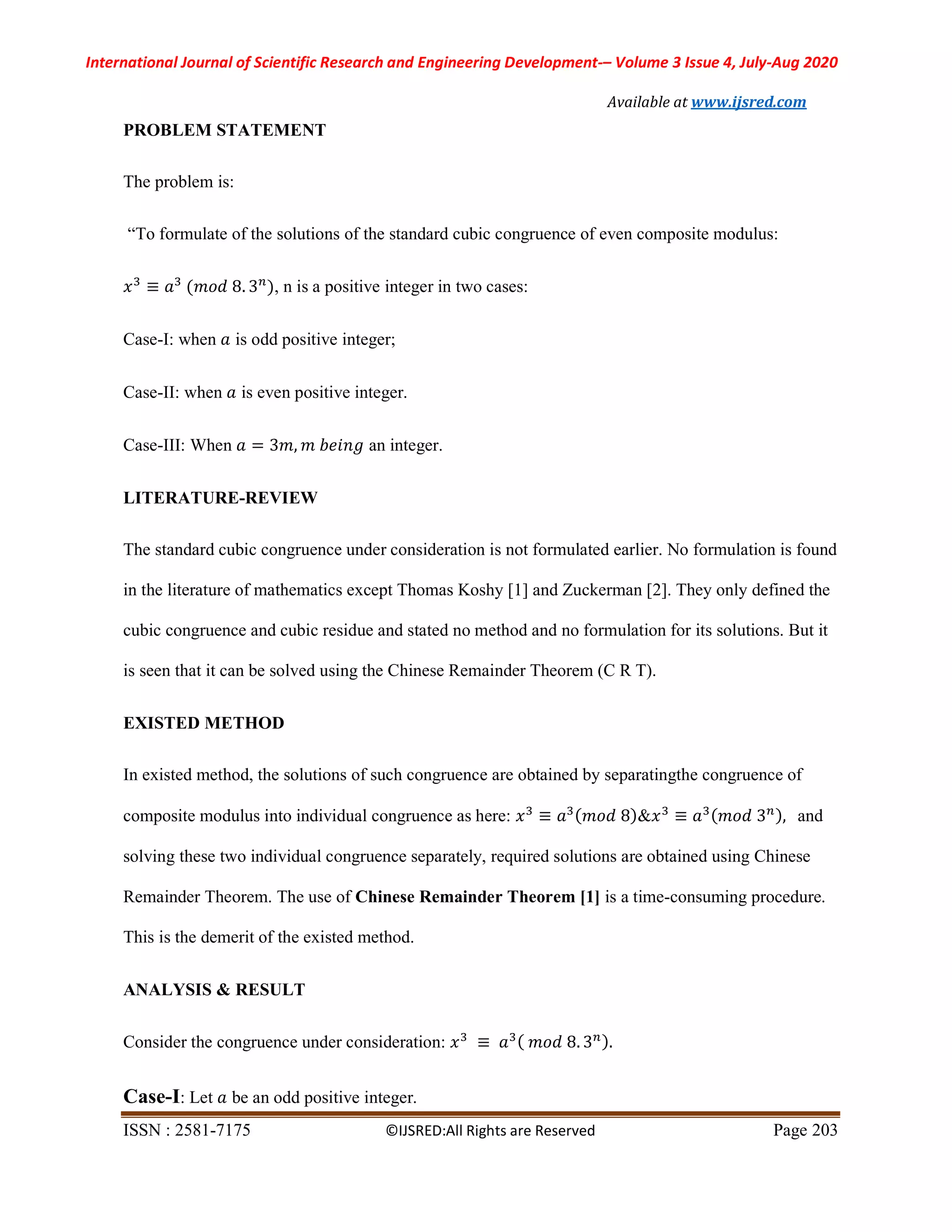 This document presents a formulation for solving a standard cubic congruence of even composite modulus that is an eighth multiple of the nth power of three. The author formulates solutions for when the constant term a is an odd positive integer, even positive integer, and equal to 3m where m is an integer. The formulations show there are three solutions when a is odd, twelve solutions when a is even, and nine solutions when a equals 3m. Several examples are provided to demonstrate the application of the formulations.