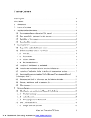 The research proposal by Debashish Mandal aims to examine the adoption of social media in small businesses, particularly its impact on entrepreneurial networks. The study intends to develop a social media adoption model tailored for small businesses, address literature gaps, and utilize an action research strategy involving local businesses. It outlines research questions regarding motivations for usage, user behavior differences, and the addition of value to existing networks through platforms like Facebook.