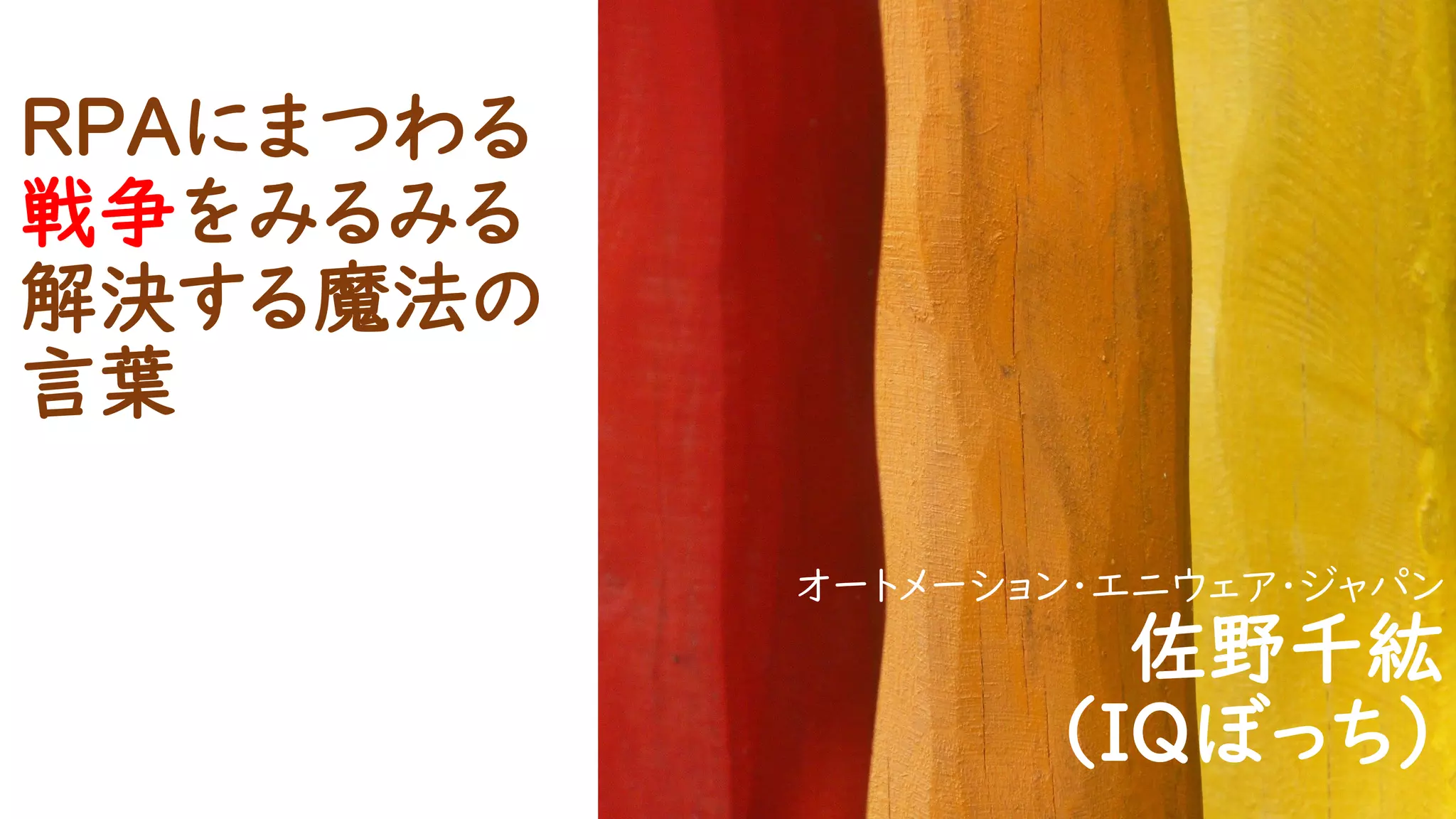 RPAにまつわる 戦争をみるみる 解決する魔法の 言葉 オートメーション・エニウェア・ジャパン 佐野千紘 (IQぼっち)