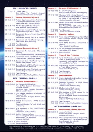 The document outlines the agenda and participant details for the 16th Annual International Conference on European RPAS Policy & Regulatory Forum hosted by UVS International from June 23-26, 2014, in Brussels, Belgium. It includes opening speeches, sessions on national community views, European RPAS roadmap, regulatory updates, privacy and data protection, and civil operations, featuring various speakers from multiple countries. The event aims to discuss integration of remotely piloted aircraft systems into EU airspace and regulatory frameworks, highlighting stakeholder collaboration and expert contributions.