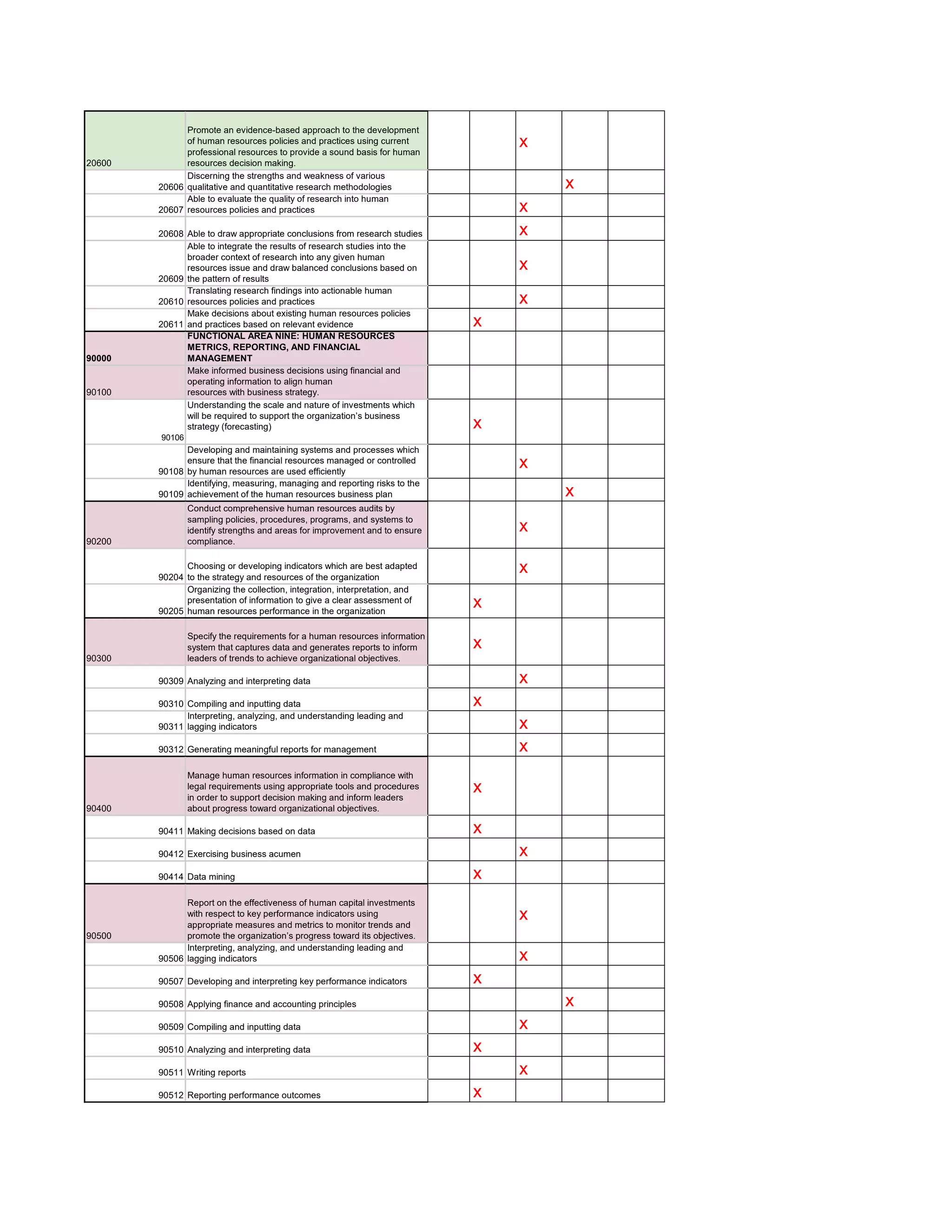 The document outlines various responsibilities, competencies, and skills (RPCs) associated with a course on human resources. It includes 10 functional areas that cover topics like strategy, professional practice, research, metrics, and financial management. Each functional area lists multiple RPCs that provide descriptions of relevant skills, with indicators of whether the competency was developed through the course.