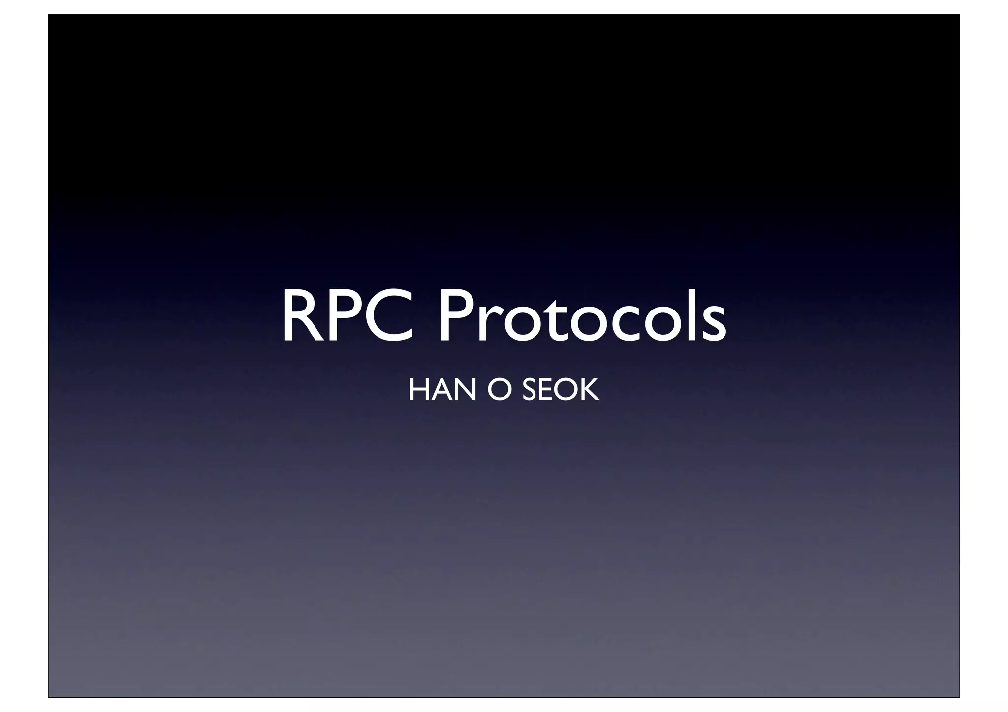 RPC protocols like SOAP, XML-RPC, JSON-RPC, and Thrift allow for remote procedure calls between a client and server. RPC works by having a client call an RPC function, which then calls the service and executes the request. The service returns a reply and the program continues. Interface layers can be high-level existing API calls, middle-level custom API calls generated by a compiler, or low-level direct RPC API calls. Popular data formats used include XML, JSON, HTTP, and TCP/IP. Thrift is an open-source protocol developed by Facebook that supports many programming languages. It generates stubs for easy client-server communication. Avro and Protocol Buffers also generate stubs and are supported by languages like
