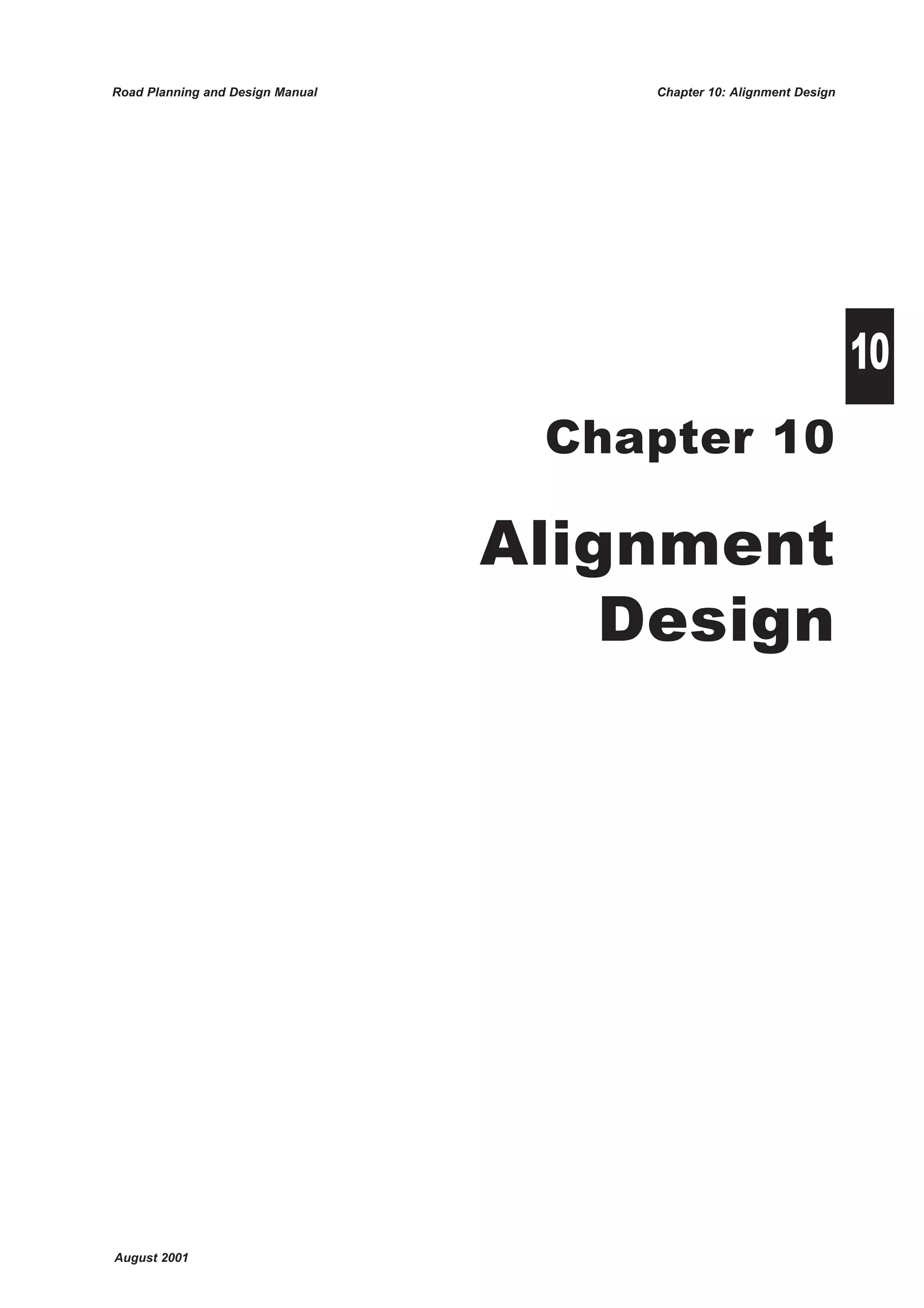 This chapter of the Road Planning and Design Manual discusses alignment design principles and coordination. It emphasizes taking a holistic approach that considers engineering requirements as well as landscape, environmental, and community factors. The chapter covers fitting road alignments to the surrounding terrain using different design approaches. It also discusses driver perception of roadways and how alignment design can help provide drivers with clues about the road ahead to minimize safety risks, especially when driver perception may be reduced.