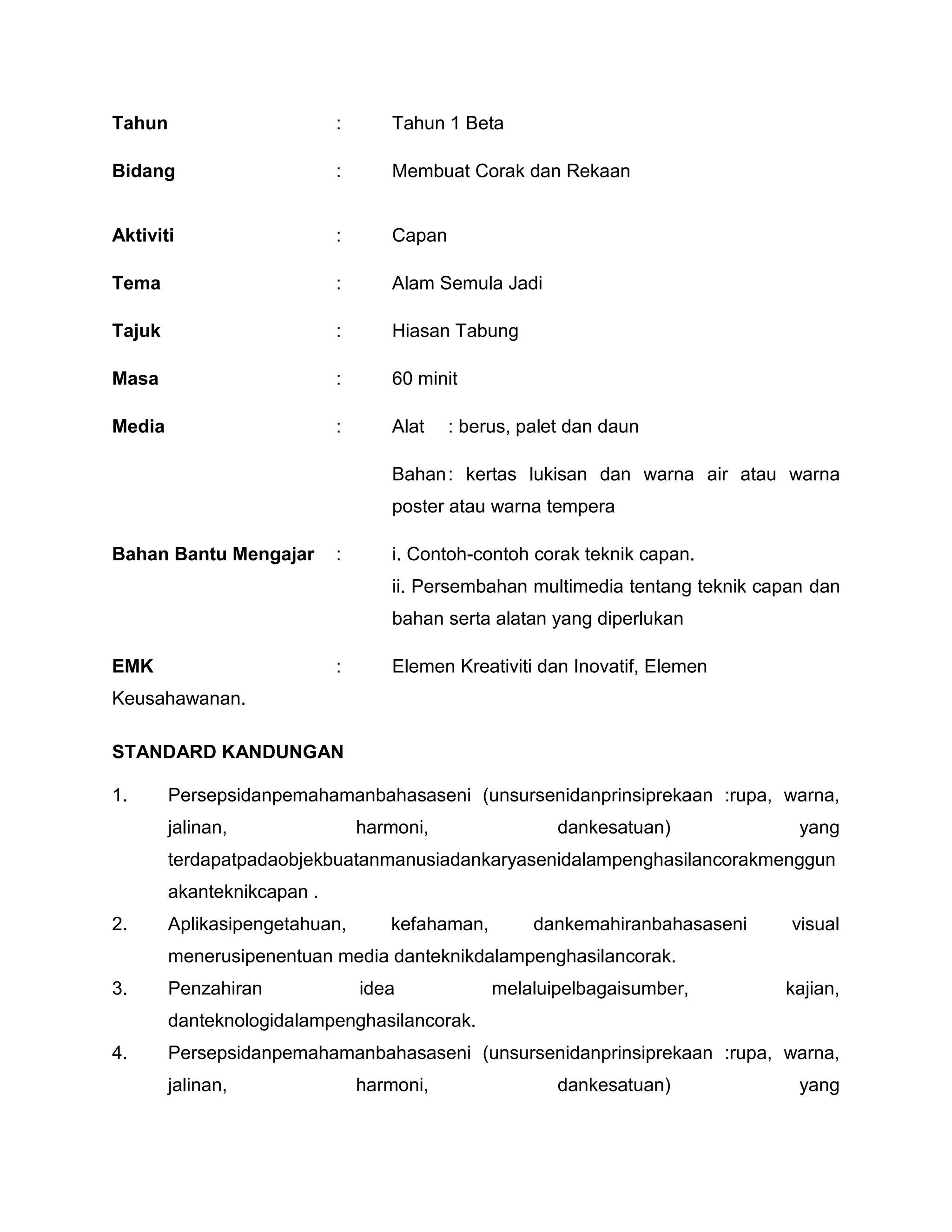 Dokumen tersebut merangkum aktiviti seni kreatif membuat corak menggunakan teknik capan untuk murid tingkatan satu. Ia menyenaraikan bahan, alat, langkah-langkah dan standard pembelajaran untuk aktiviti tersebut yang memberi tumpuan kepada pengenalan teknik capan, aplikasi pengetahuan seni, ekspresi kreatif dan apresiasi hasil karya.