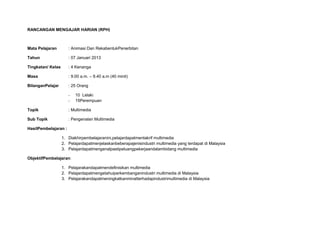 Dokumen ini adalah rancangan pengajaran harian untuk mata pelajaran animasi dan rekabentuk penerbitan yang bertujuan memperkenalkan multimedia kepada pelajar tingkatan 4. Hasil pembelajaran termasuk pemahaman tentang takrif multimedia, industri multimedia di Malaysia, dan peluang pekerjaan dalam bidang tersebut. Pengajaran melibatkan aktiviti interaktif seperti soal jawab, penerangan, dan latihan untuk memastikan pelajar memahami elemen-elemen multimedia.