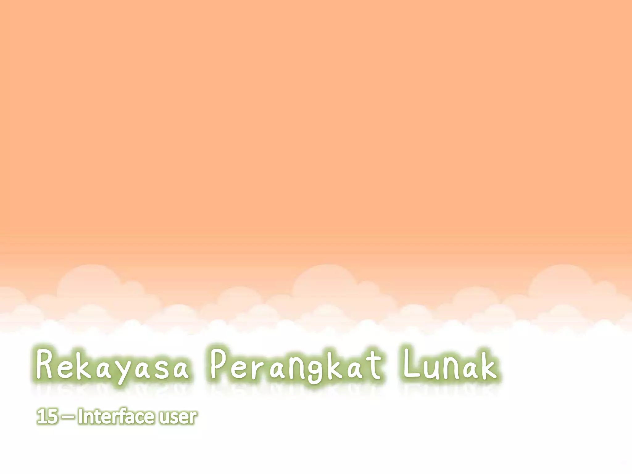 Dokumen ini membahas prinsip-prinsip perancangan interface pengguna dalam sistem komputer, termasuk interaksi pengguna, presentasi informasi, dan evaluasi interface. Desain yang baik harus mempertimbangkan kemampuan pengguna serta menyediakan bantuan yang relevan. Selain itu, penggunaan warna dan sistem dukungan juga diuraikan sebagai elemen penting dalam menciptakan pengalaman pengguna yang efektif.
