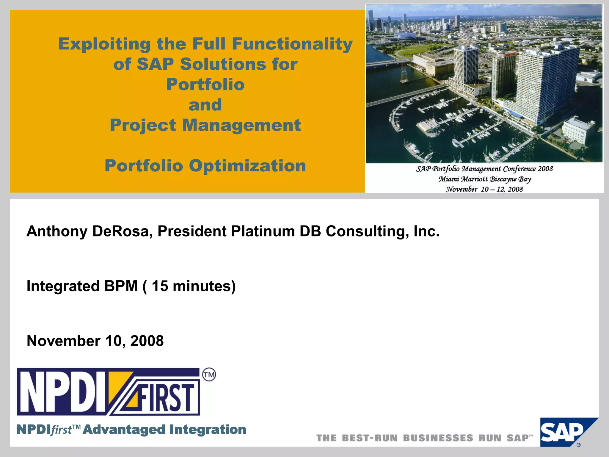 This document discusses using business process management (BPM) with SAP solutions to optimize portfolio and project management. It provides examples of business processes that are good candidates for BPM, such as manual processes with limited visibility and flexibility. The key capabilities of BPM include integrated process monitoring and measurement, tools to drive process improvement, and graphical workflow status views. BPM can be used to model project-oriented processes and automate events. It discusses using BPM components like the process modeler, orchestration engine, and portal together to manage operations, monitor health, and optimize processes.