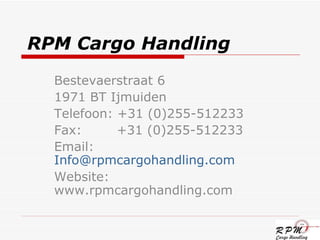 RPM Cargo Handling is a logistics service provider that offers airfreight, sea freight, warehousing, customs, and transportation services. They focus on quality, flexibility, and innovation. Their specialized teams offer efficient and fast service to meet all customer needs. They can manage all types of transport and coordinate deliveries professionally with highly automated processes.