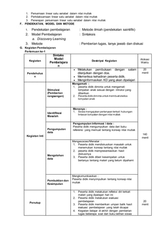 Rencana Pelaksanaan Pembelajaran (RPP) ini membahas pelajaran Matematika tentang konsep nilai mutlak untuk siswa kelas X semester 1. Materi akan disampaikan dalam 4 pertemuan melalui pendekatan ilmiah dan model pembelajaran discovery learning. Tujuannya adalah agar siswa mampu menyusun persamaan dan pertidaksamaan linear satu variabel yang memuat nilai mutlak, serta menyelesaikan masalah terkaitnya.