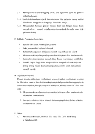 Rencana Pelaksanaan Pembelajaran (RPP) ini membahas pembelajaran geometri untuk siswa kelas X semester 2. Tujuannya adalah agar siswa dapat menemukan konsep dan prinsip geometri serta memecahkan masalah aktual secara tepat dan kreatif melalui diskusi kelompok. Materi yang diajarkan meliputi kedudukan titik, jarak antara titik, garis dan bidang. Metode pembelajarannya menggunakan pendekatan saintifik dengan discovery