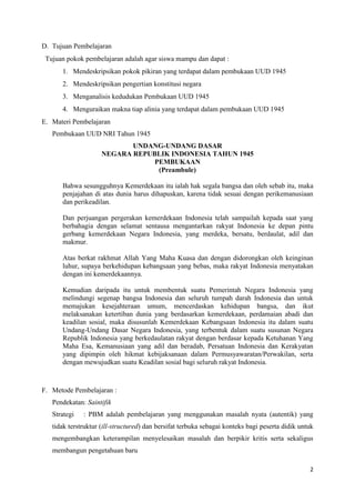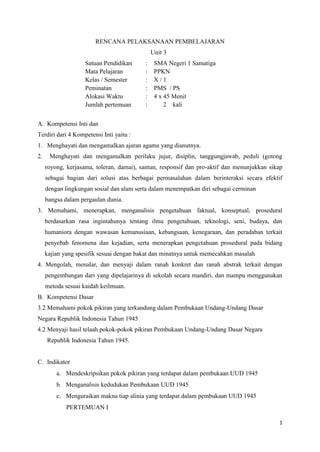 Dokumen ini merupakan rencana pelaksanaan pembelajaran untuk mata pelajaran PPKn di SMA Negeri 1 Samatiga, dengan fokus pada pembukaan Undang-Undang Dasar Negara Republik Indonesia Tahun 1945. Pembelajaran meliputi pengertian konstitusi, pokok pikiran dalam pembukaan UUD 1945, dan analisis makna setiap alinia, menggunakan metode pembelajaran saintifik. Penilaian dilakukan melalui observasi, presentasi, dan portofolio untuk mengevaluasi proses dan hasil belajar siswa.