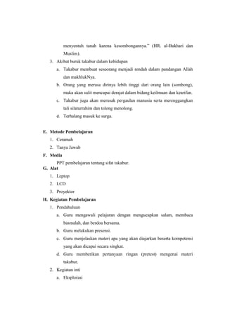 Dokumen ini adalah rencana pelaksanaan pembelajaran (RPP) untuk mata pelajaran Pendidikan Agama Islam di SMP kelas IX, fokus pada sifat takabur. RPP mencakup tujuan, materi, metode pembelajaran, dan evaluasi yang berhubungan dengan pengertian takabur, dalil naqli, dan akibat buruknya. Kegiatan pembelajaran meliputi ceramah, tanya jawab, dan penggunaan media presentasi.