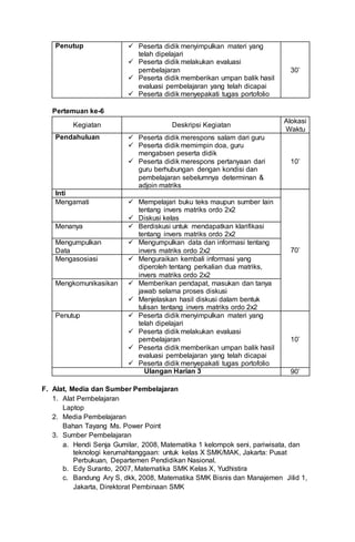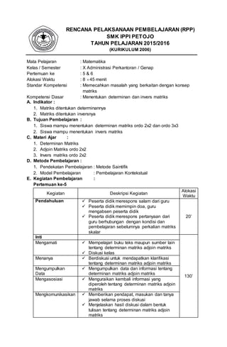 Dokumen ini adalah Rencana Pelaksanaan Pembelajaran (RPP) untuk mata pelajaran Matematika di SMK IPPI Petojo tahun ajaran 2015/2016, yang mencakup standar kompetensi dan kompetensi dasar terkait determinan dan invers matriks. Pembelajaran terdiri dari dua pertemuan dengan alokasi waktu 8 x 45 menit, mengaplikasikan metode saintifik dan konteksual untuk mencapai tujuan pembelajaran. Materi ajar mencakup penentuan determinan dan invers matriks ordo 2x2 dan 3x3, dengan penilaian melalui tes tertulis.