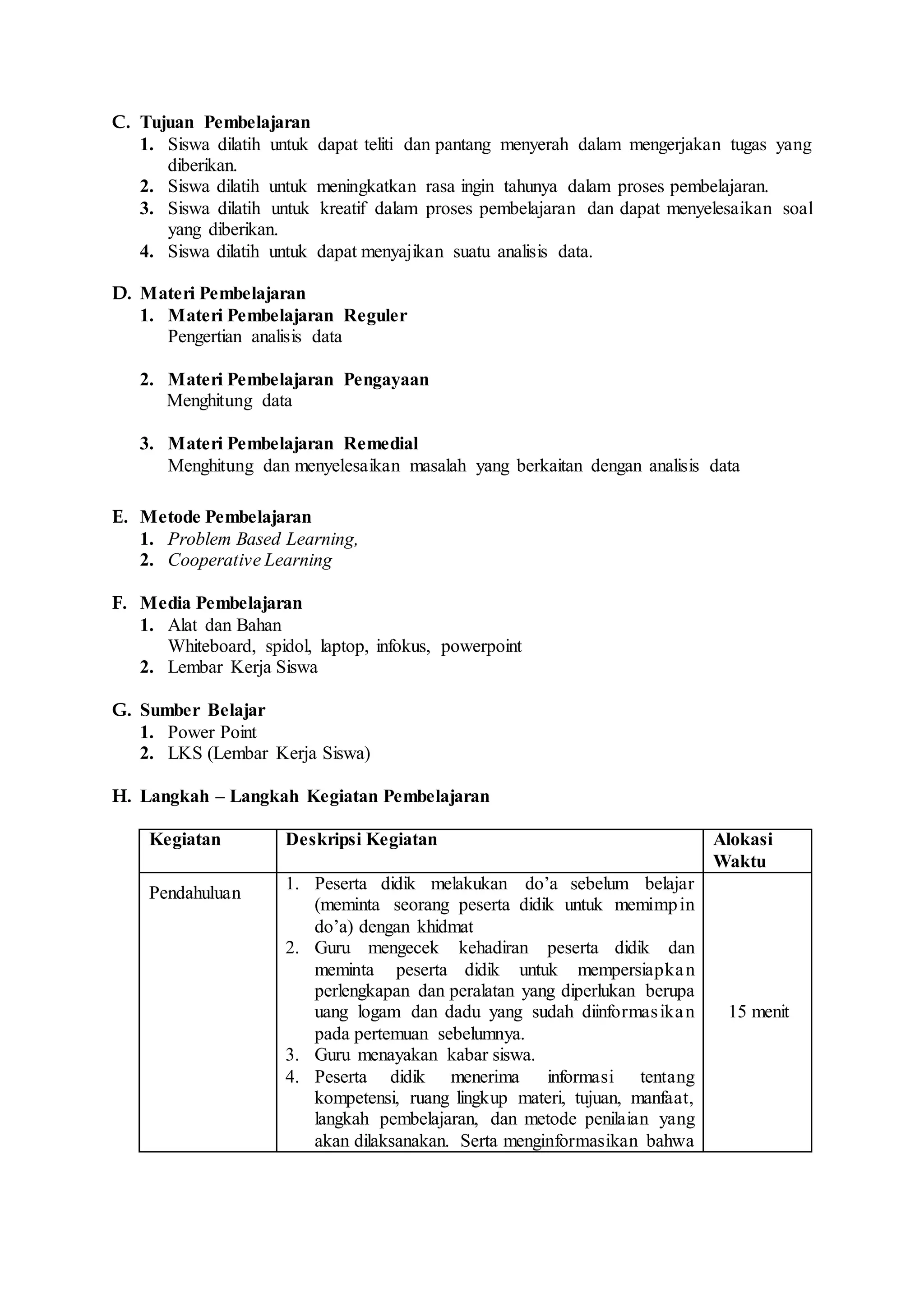 RPP ini membahas pembelajaran statistika tentang analisis data untuk siswa kelas VIII SMP Negeri 2 Kota Serang. Materi yang diajarkan adalah distribusi data, nilai rata-rata, median, modus, dan sebaran data. Siswa dibagi menjadi kelompok untuk mengumpulkan dan menganalisis data, lalu menyajikan hasilnya. Penilaian dilakukan dengan tes tertulis, penugasan, dan presentasi kelompok.