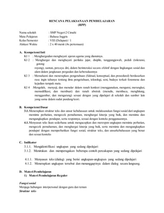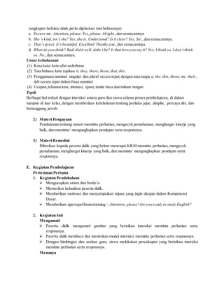 Rencana pelaksanaan pembelajaran (RPP) ini membahas pembelajaran bahasa Inggris untuk siswa kelas VIII tentang interaksi antara guru dan siswa. Materi yang diajarkan meliputi meminta perhatian, mengecek pemahaman, menghargai kinerja baik, dan meminta pendapat. Metode pembelajarannya meliputi mengamati, menanya, mengeksplorasi, mengasosiasi, dan mengomunikasikan. Penilaian dilakukan dengan tes tertulis