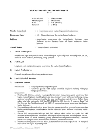 Dokumen ini adalah Rencana Pelaksanaan Pembelajaran (RPP) untuk mata pelajaran matematika kelas VIII semester 2 di SMP dan MTs, yang mencakup beberapa kompetensi dasar terkait lingkaran, seperti menentukan unsur, menghitung keliling dan luas, serta memahami relasi dan fungsi. RPP ini juga merincikan metode pengajaran, alokasi waktu, tujuan pembelajaran, serta langkah-langkah kegiatan mengajar dengan materi dari buku paket. Selain itu, RPP mencakup penilaian melalui tugas individu dan kuis.