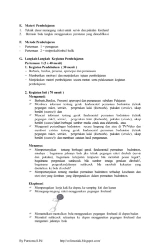 Rencana pelaksanaan pembelajaran ini membahas tentang pelajaran penjas orkes kelas VII tentang permainan badminton. Pembelajaran ini bertujuan agar siswa dapat melakukan teknik dasar badminton seperti pegangan raket dan pukulan dengan benar serta bermain badminton dengan menunjukkan sikap sportif dan disiplin. Materi pembelajaran meliputi teknik pegangan raket, servis, dan pukulan dasar badminton, sedangkan metode pembel